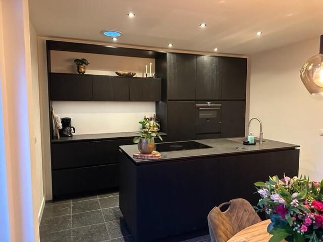 Een keuken gemaakt van edel gefineerd Eiken en afgewerkt met een zwarte beits. Deze beits is in meerdere kleuren beschikbaar.
